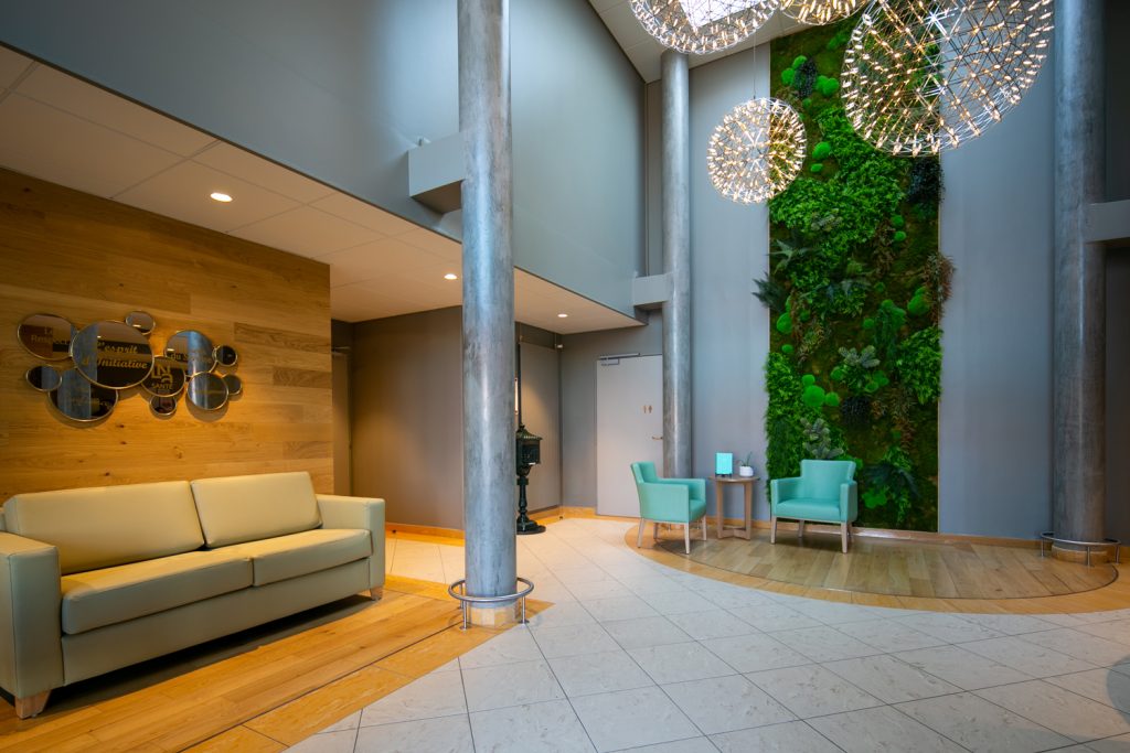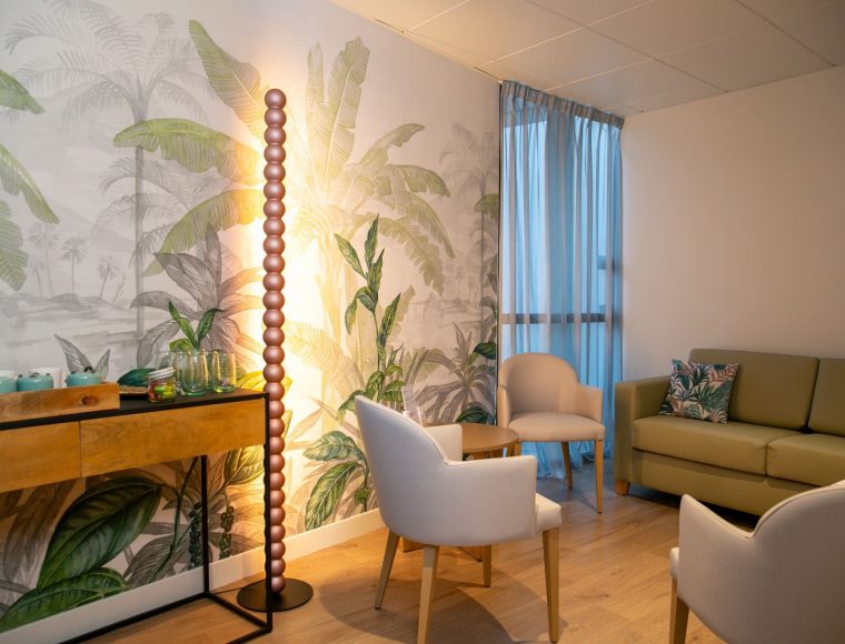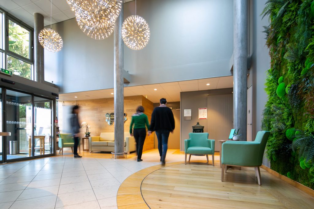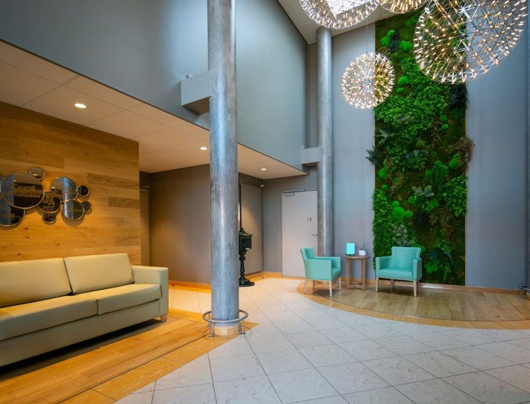 Le hall d’accueil de l’Ehpad nantais, Le Parc de Diane ouvre à présent ses portes sur un vaste mur végétalisé mettant en valeur la belle hauteur sous plafond et sa lumineuse perspective. L’agrandissement du salon des familles offre quant à lui une belle ouverture sur l’extérieur.