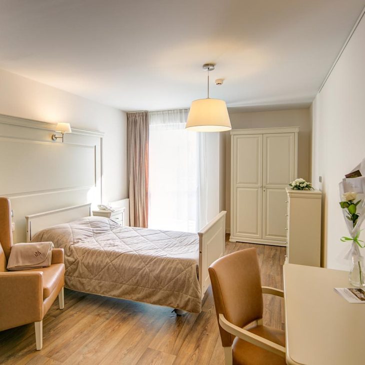 La résidence Les Camélias, dans les Pyrénées-Orientales, propose de vastes chambres de plus de 20 m² individuelles ou doubles pour les couples. Chaque chambre dispose d’une salle d’eau privative et est pré-équipée avec, notamment, un lit médicalisé. Cet espace privé est personnalisable, pour que le senior se sente comme chez lui.