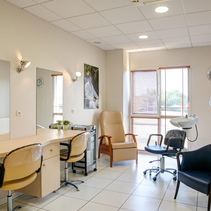 Moderne, notre Ehpad en Vendée dispose d’équipements de soin et de bien-être de pointe : salle dédiée aux soins de rééducation, espace Snoezelen, balnéothérapie, salon de coiffure…